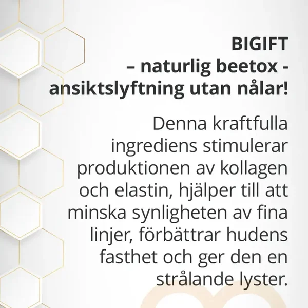 Kombinationen av naturliga ingredienser – bigift, hyaluronsyra och antioxidantrika extrakt – återfuktar på djupet, förbättrar hudens elasticitet och reducerar synligt fina linjer. Vid regelbunden användning blir huden mjukare, fastare och får en hälsosam lyster.